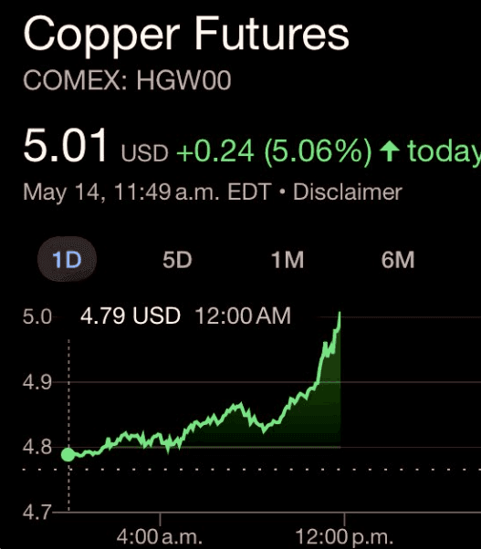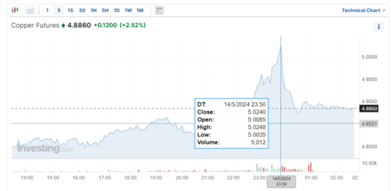北京时辰周二晚23:50分,好意思国往还时段,纽铜出现逼空行情,纽约铜期货盘中飙升5.5%,Comex 7月交割的铜价跃升至日内高点,达到5.026好意思元/磅,距离2022年3月俄乌冲突早期时创下的历史高点5.0395好意思元仅一步之遥。